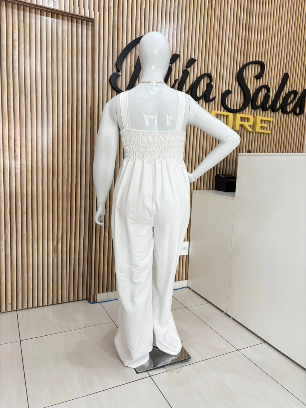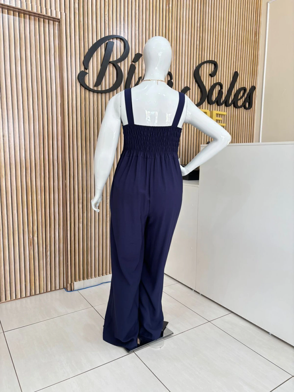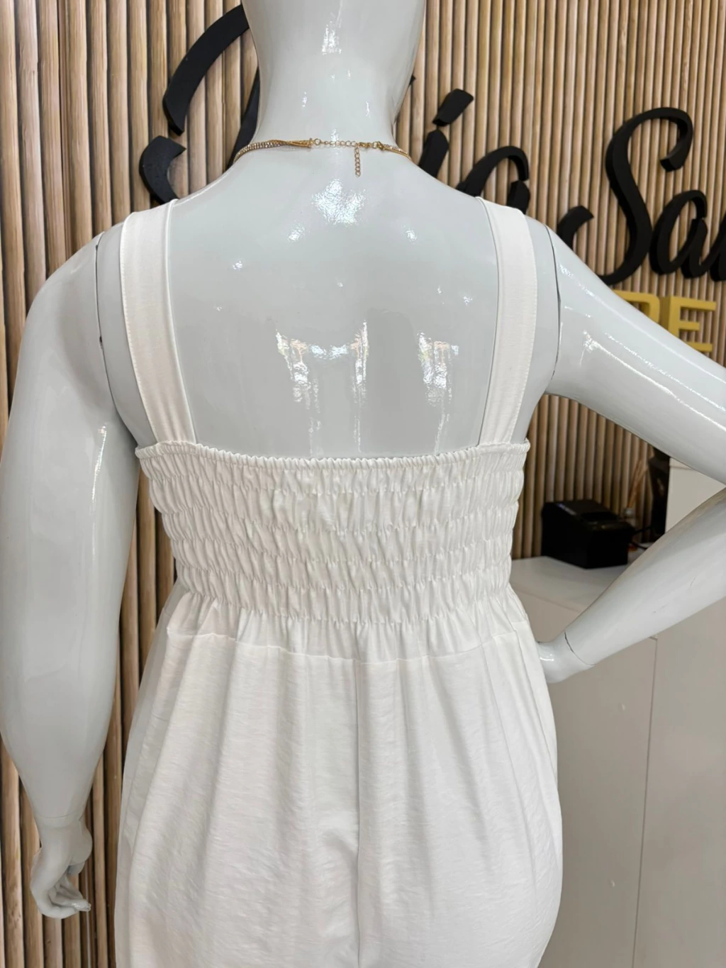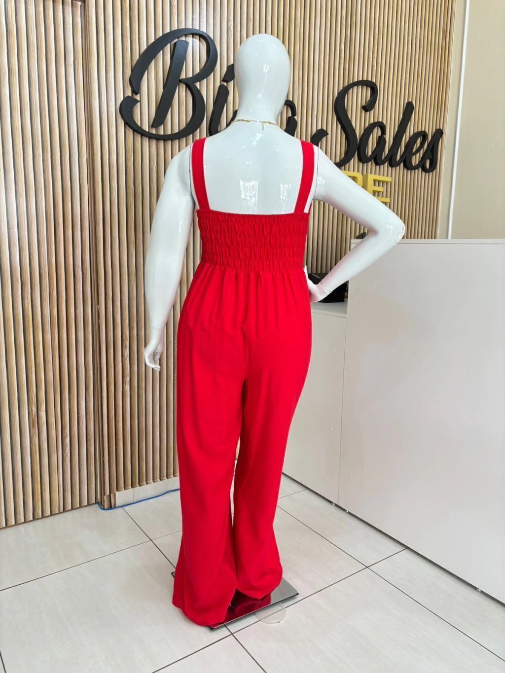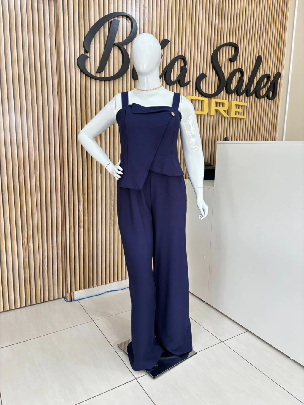 Macacão é uma peça única, elegante e moderna. Confeccionada em tecido sensorial, estilo alfaiataria. O modelo é Pantalona, com caimento solto, possui alças largas e decote reto, com detalhe de sobreposição no busto, possui um recorte assimétrico com uma pala que forma um leve babado, valorizando a cintura e trazendo movimento à peça. Acompanha bojo. É uma opção perfeita para eventos sociais e ocasiões que pedem conforto e sofisticação.
