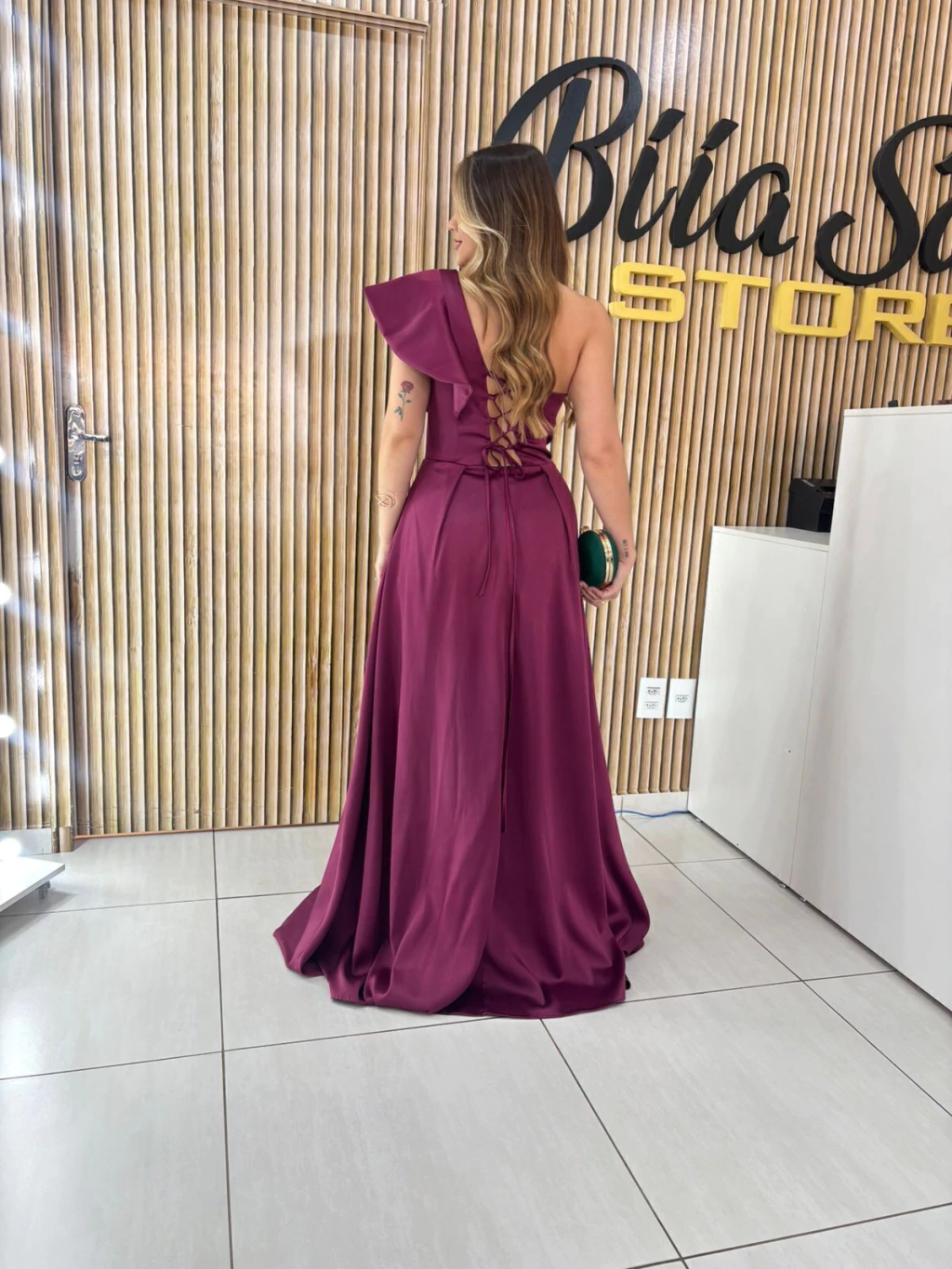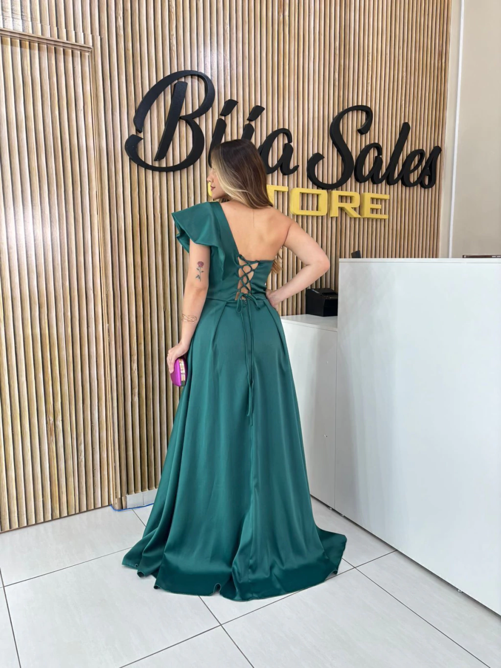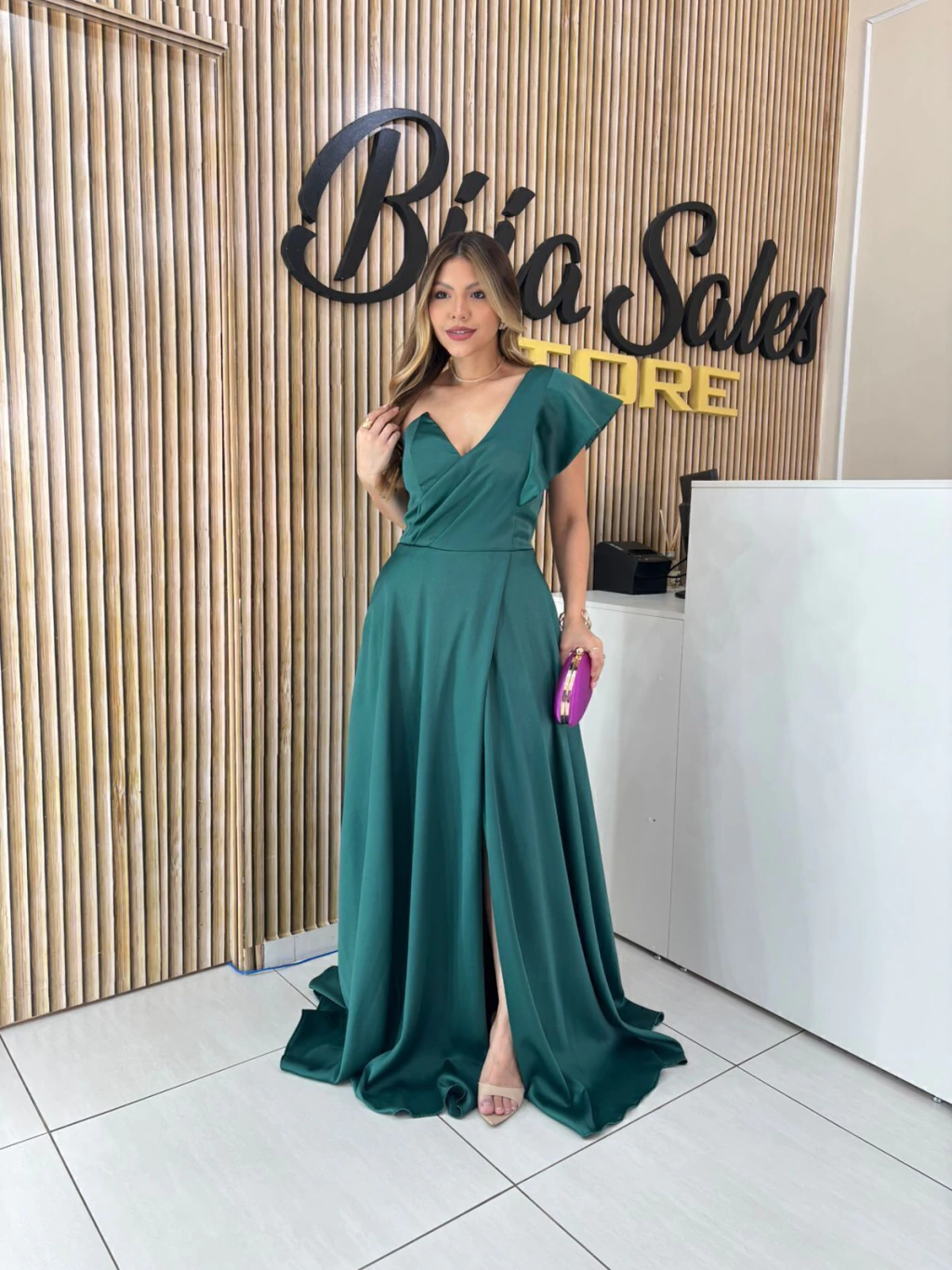 Vestido no tecido Prada. Decote em V profundo cruzado, valorizando o colo. Mangas única com babado, que cria um efeito romântico e delicado nos ombros. Cintura Marcada, dando definição à silhueta. Acompanha bojo. Possui uma fenda frontal discreta, que diciona um charme e sencualidade sutil. Na parte das costas, tem um cruzado e fechamento em ziper. Ideal para Eventos elegantes, casamentos, formaturas e momentos que pedem elegancia.